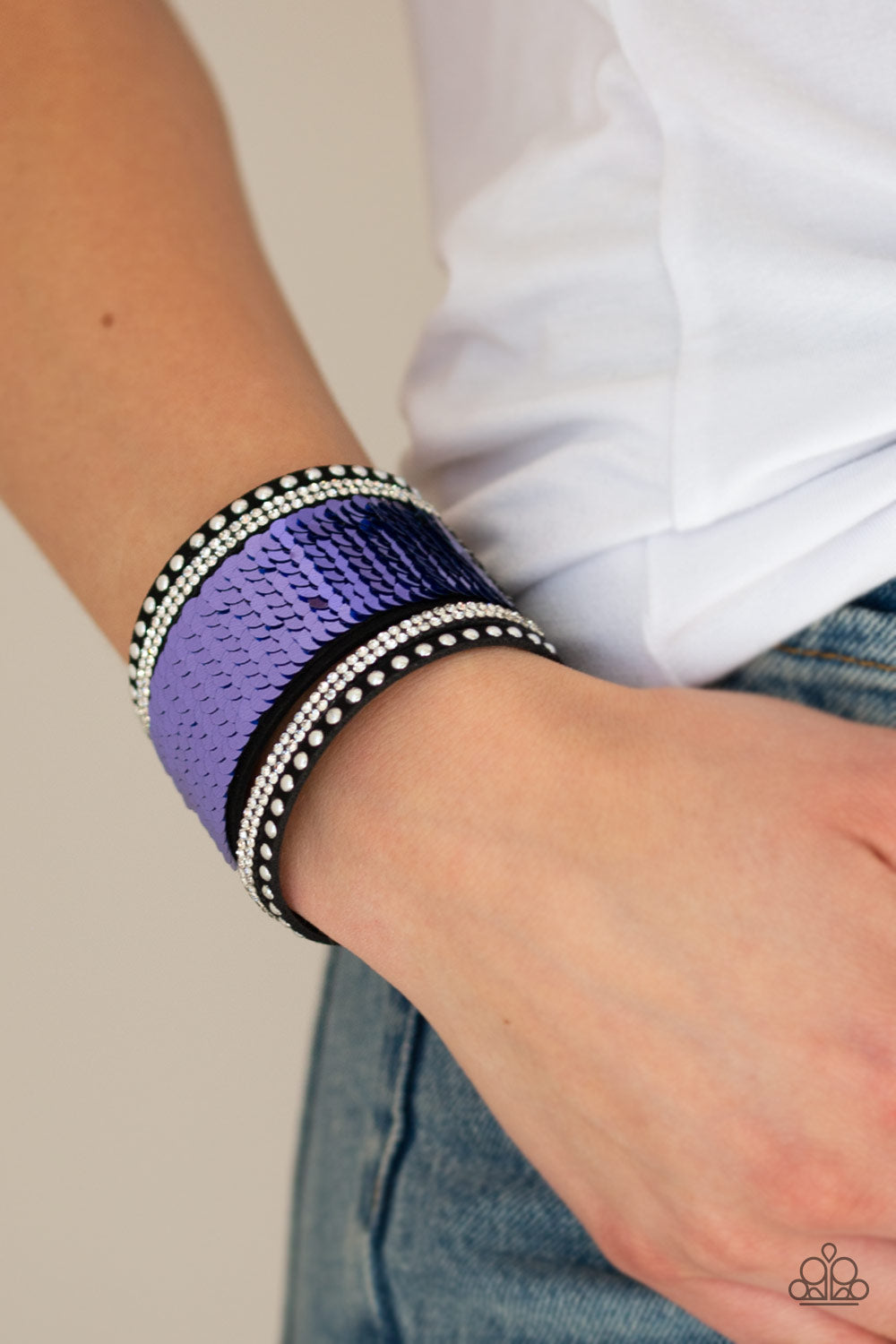 Shiny silver studs, glassy white rhinestones, and shimmering sequins are sprinkled across a thick black suede band that has been spliced into five glittery rows. Bracelet features reversible sequins that change from blue to purple. Features an adjustable snap closure.