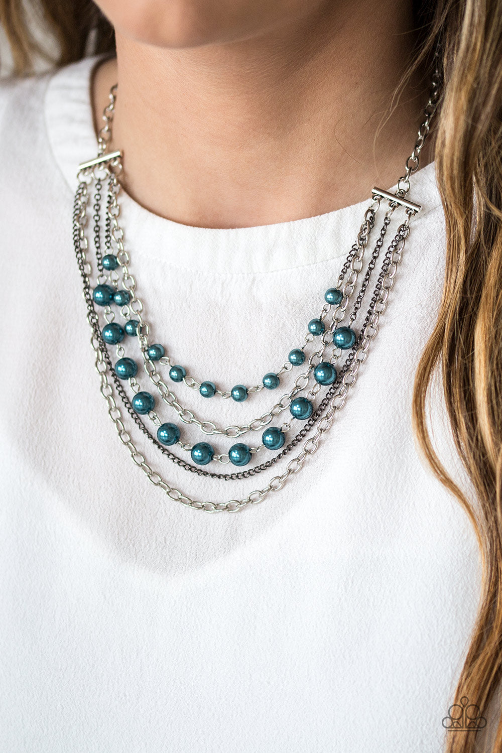 Varying in size and shimmer, glistening gunmetal and silver chains layer below the collar. Pearly blue beads are threaded along the silver strands adding a refined shimmer to the elegant palette. Features an adjustable clasp closure.