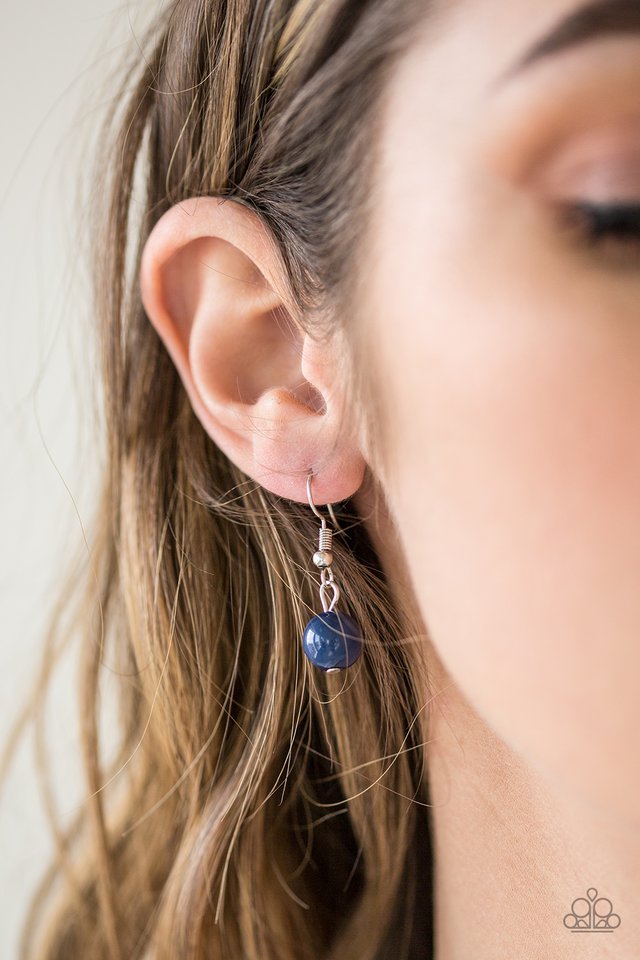 Stenciled and hammered silver accents trickle along a shimmery silver chain. Crystal-like and polished blue beading join the metallic accents, adding a flirty pop of color to the whimsical palette. A lobster clasp hangs from the bottom of the design to allow a name badge or other item to be attached. Features an adjustable clasp closure. Sold as one individual lanyard. Includes one pair of matching earrings.