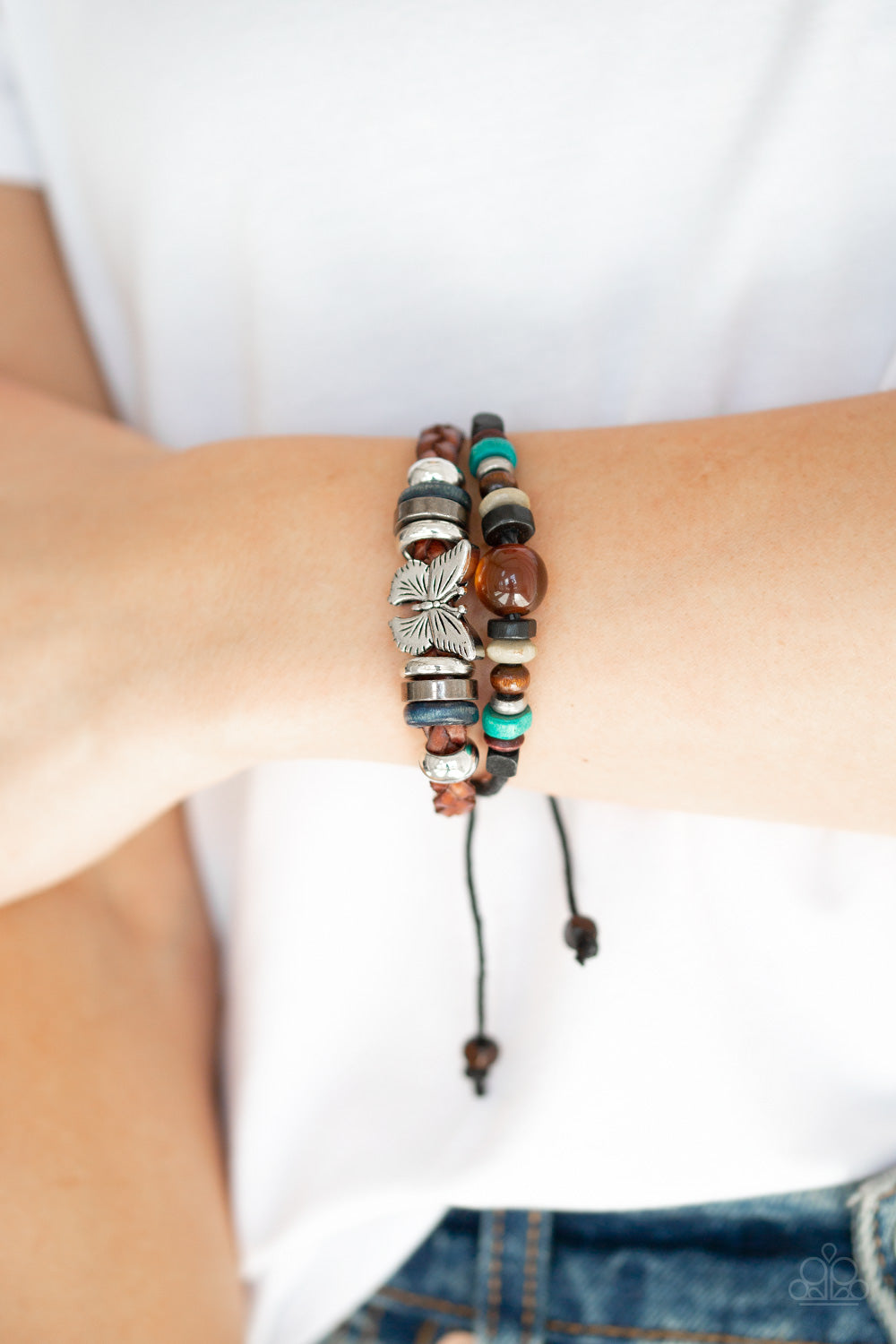 A collection of colorful wooden beads, sleek metallic accents, and a glassy orange bead slide along strands of braided brown leather and shiny black cording. A shimmery silver butterfly charm adorns the center, adding a whimsical flair to the seasonal palette. Features an adjustable sliding knot closure.