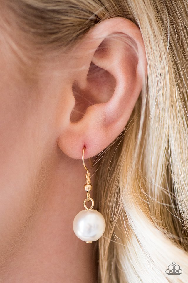 Classic white pearls trickle along doubled strands of glistening gold chain, creating refined layers across the chest. A lobster clasp hangs from the bottom of the design to allow a name badge or other item to be attached. Features an adjustable clasp closure.