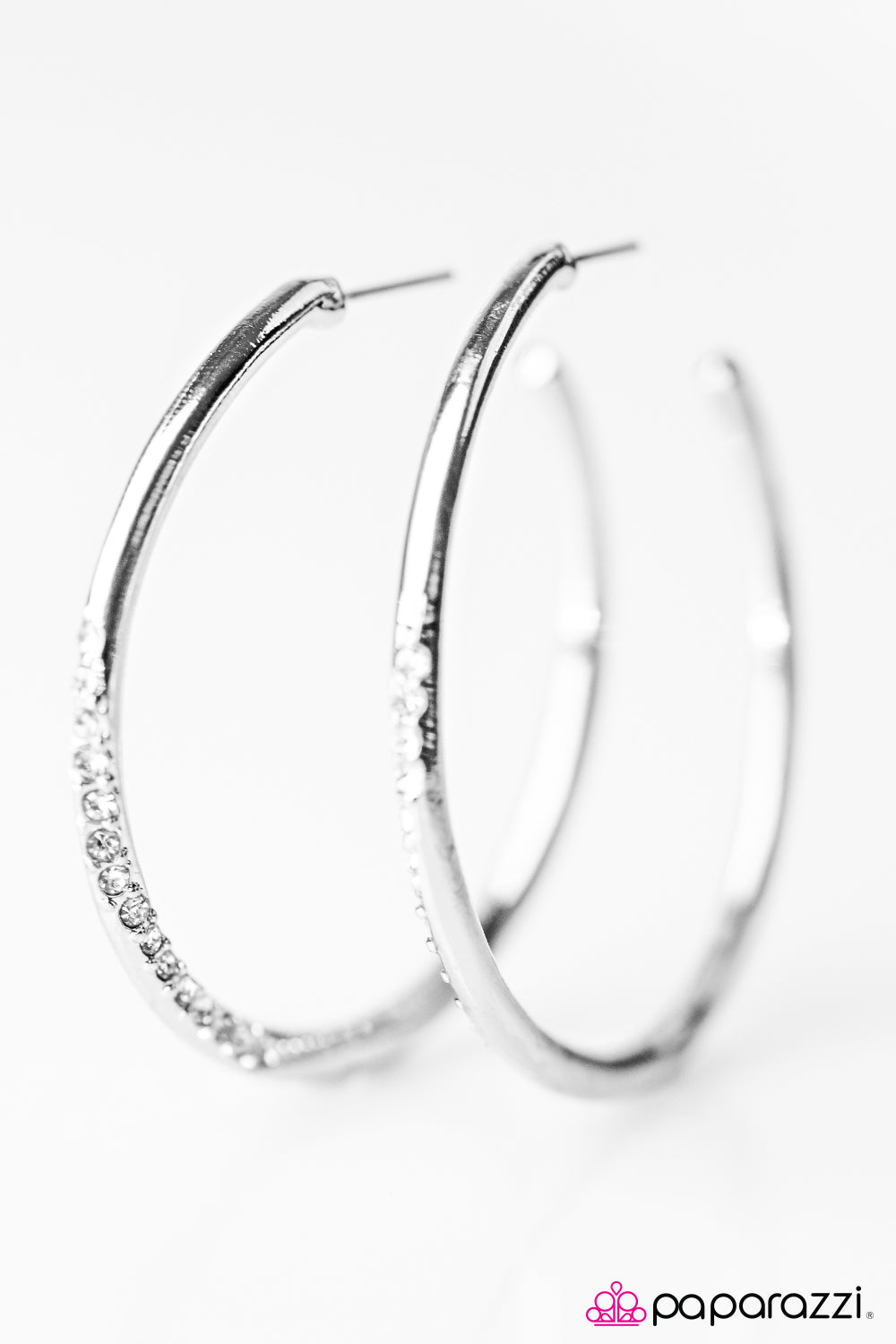 As if dipped in glitter, a ribbon of white rhinestones wraps along the bottom of a shimmery silver hoop in an edgy fashion. Earring attaches to a standard post fitting. Hoop measures 1 3/4" in diameter.