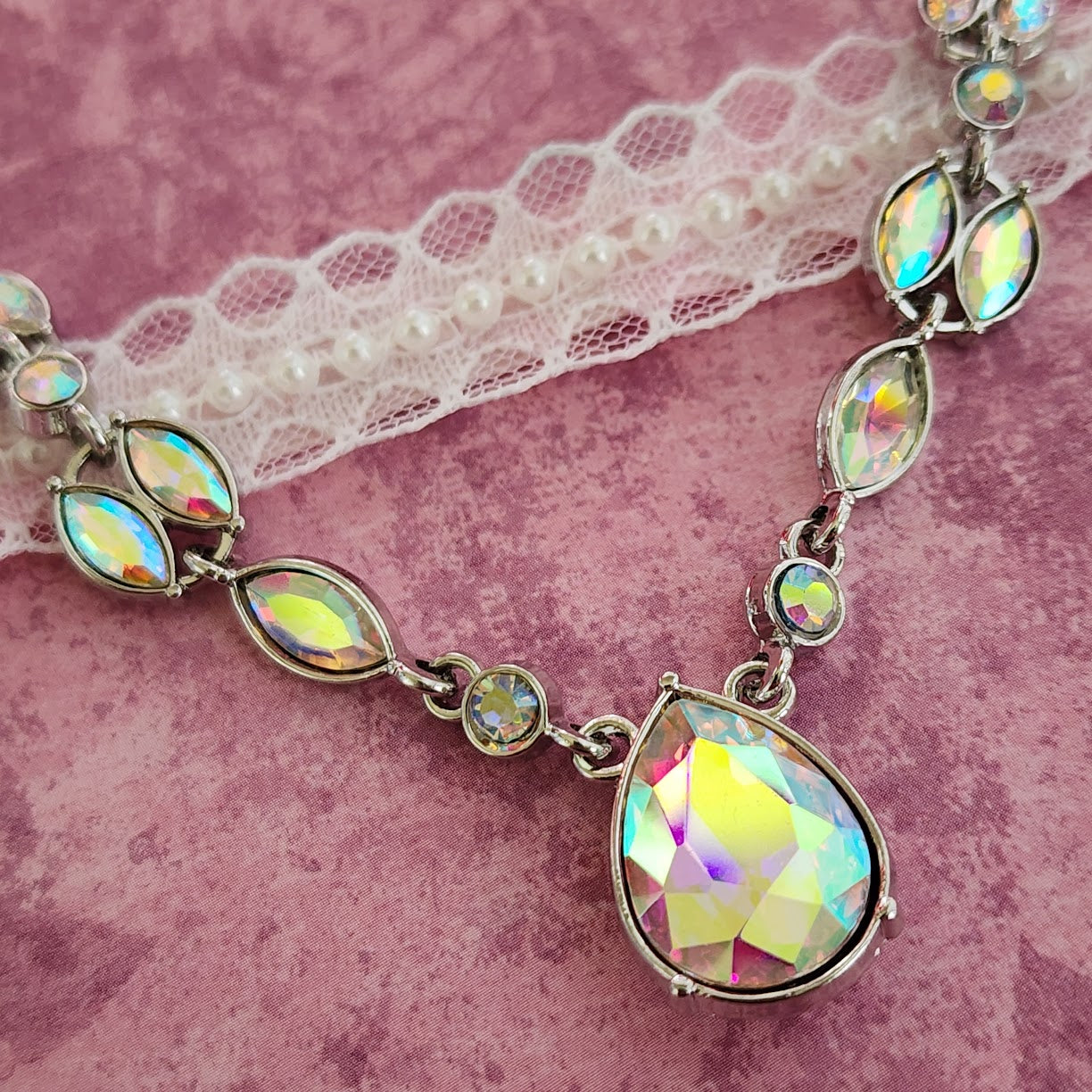 Featuring regal marquise style cuts, glittery iridescent rhinestones trickle along a shimmery silver chain below the collar. A dramatic teardrop rhinestone drips from the center, creating a breathtaking pendant. Features an adjustable clasp closure.