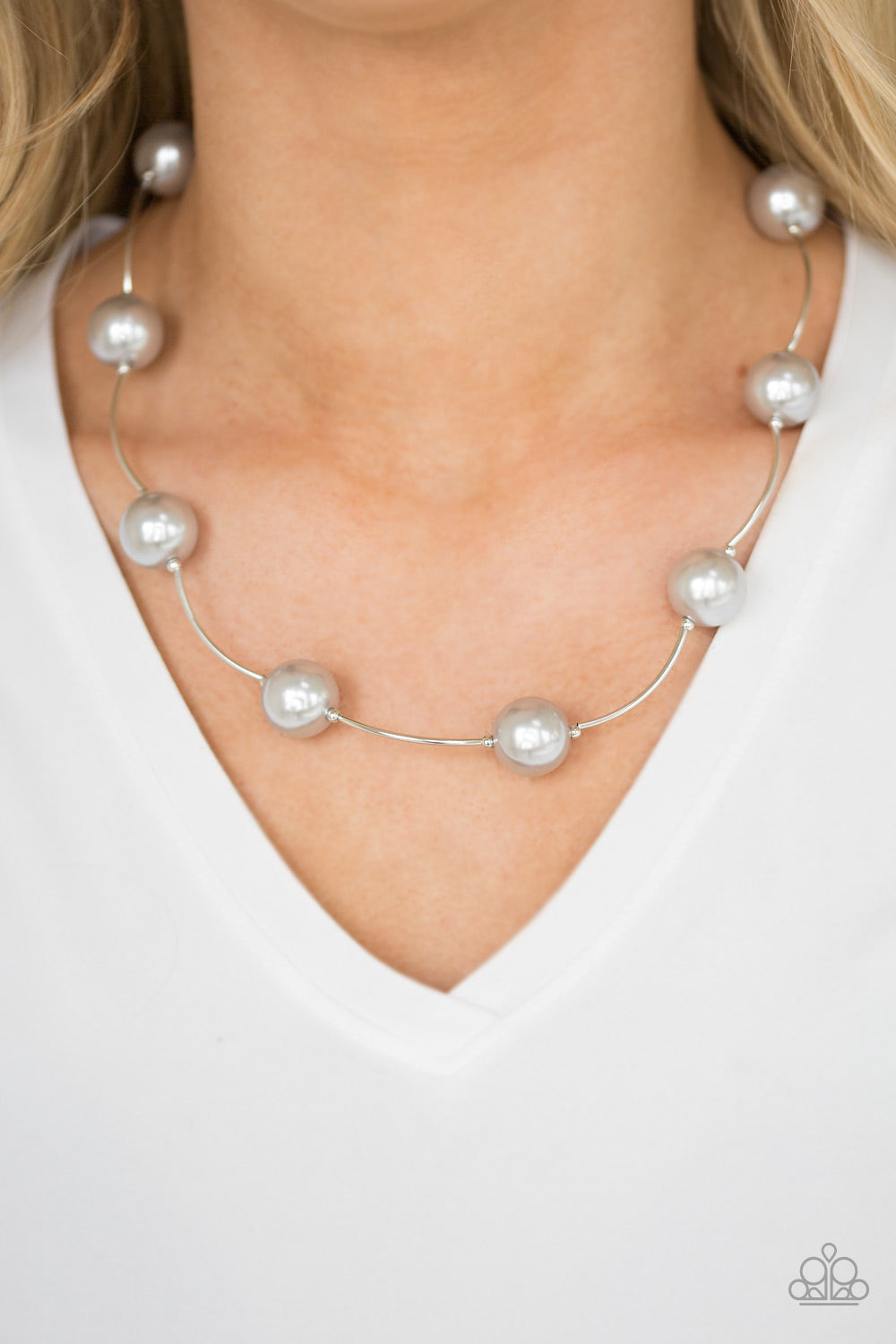 Oversized silver pearls and curved silver beads are threaded along a dainty wire, creating a dramatic look below the collar. Features an adjustable clasp closure.