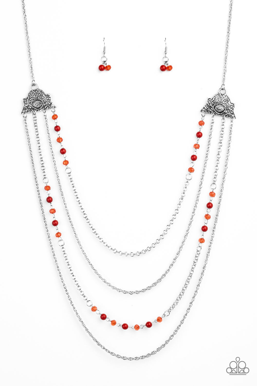 Attached to two ornate floral silver fittings, shimmery silver chains and strands of polished red and glassy crystal-like beads cascade across the chest for a whimsically layered look. Features an adjustable clasp closure.