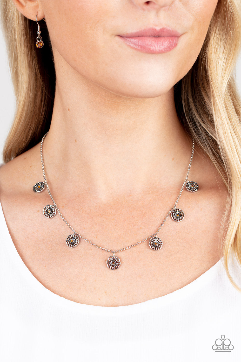 Whimsical antiqued silver floral medallions, dotted with dainty tea-colored rhinestone centers, dangle from a petite silver chain resulting in a charming allure below the collar. Features an adjustable clasp closure.