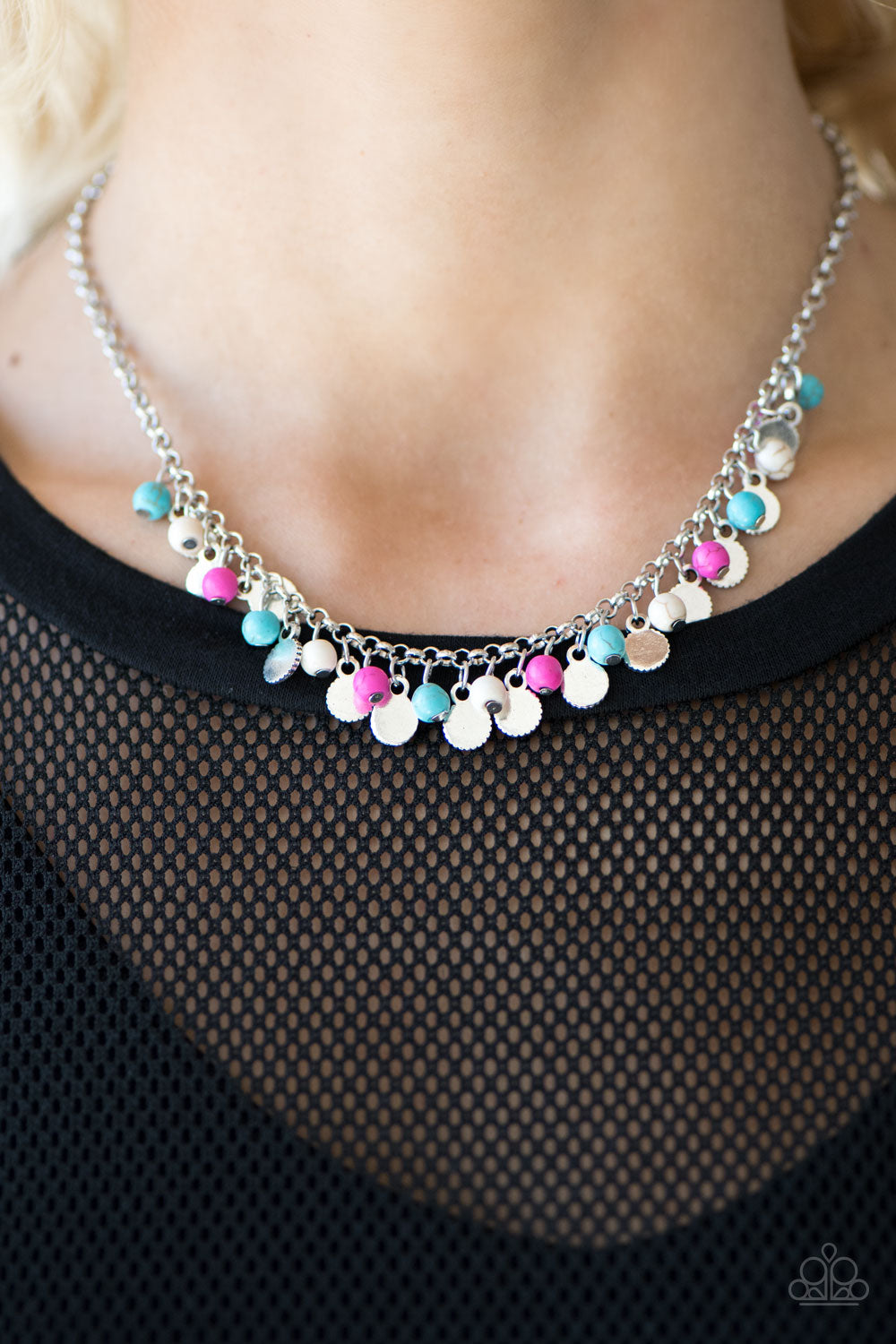 Colorful turquoise, pink, and white stone beading and serrated silver discs swing from the bottom of a shimmery silver chain, creating an earthy fringe below the collar. Features an adjustable clasp closure.