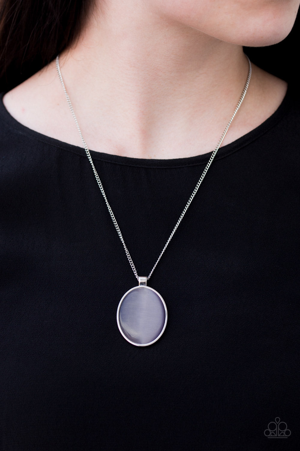 Pressed into a sleek silver frame, an oversized purple moonstone pendant swings below the collar for a whimsical look. Features an adjustable clasp closure.