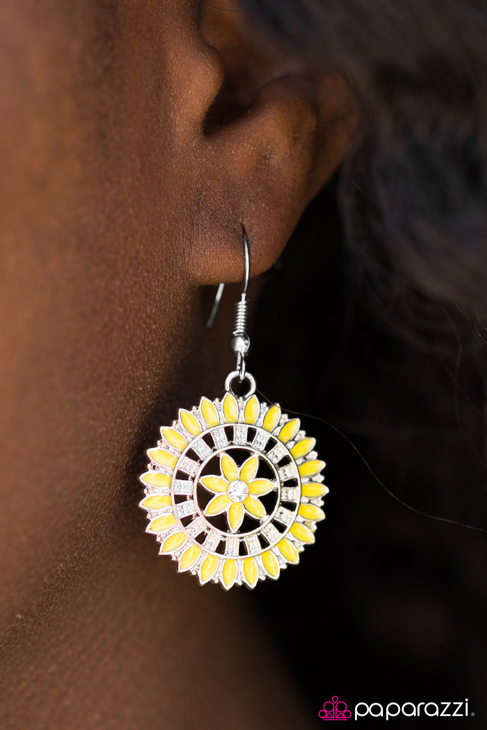 Painted in a sunny yellow finish, shiny petals spin into a whimsical floral frame. Earring attaches to a standard fishhook fitting.