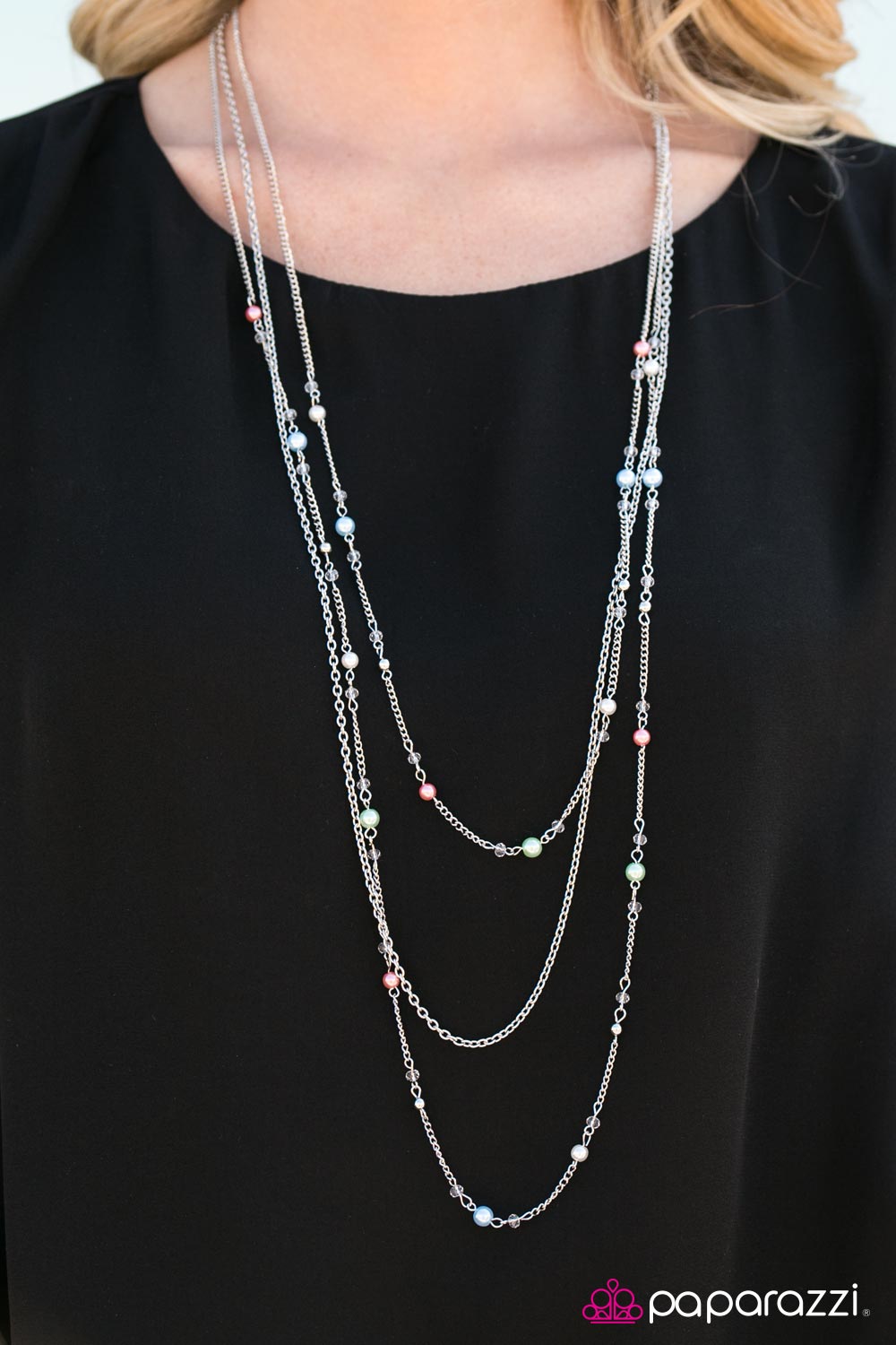Dainty multicolored pearls trickle along trestles of silver chain in a whimsically layered fashion. Splashes of silver and crystal beads are added to the summery palette for a sparkling finish. Features an adjustable clasp closure.