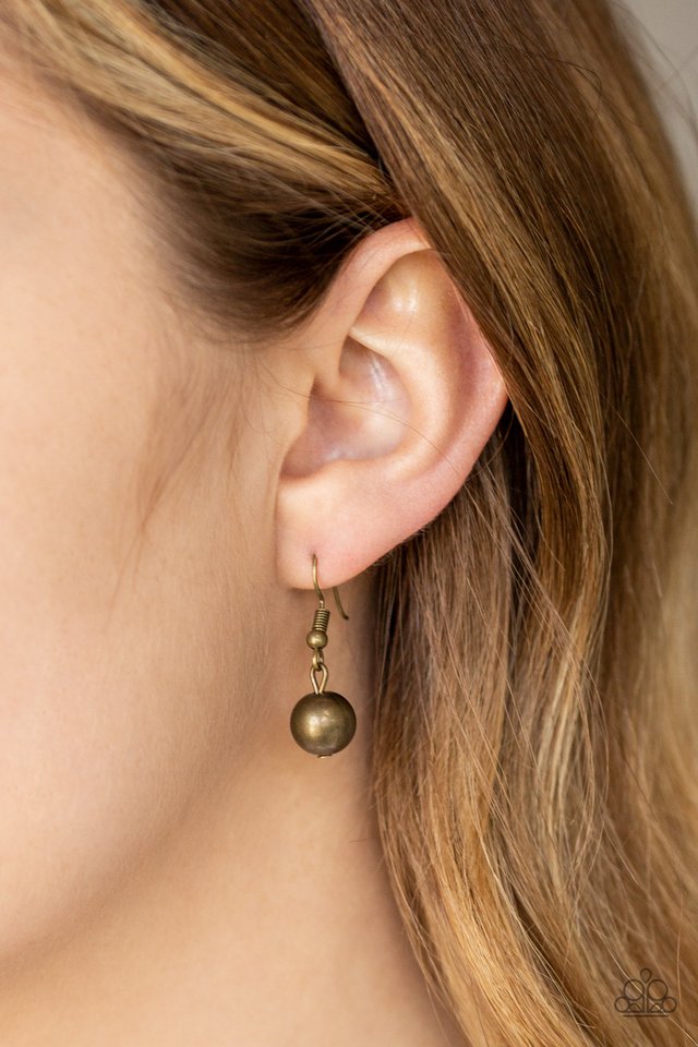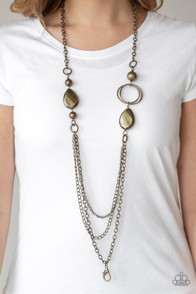 A mismatched collection of oversized brass beads, hoops, and textured brass accents give way to layers of antiqued brass chains down the chest for an edgy industrial look. A lobster clasp hangs from the bottom of the design to allow a name badge or other item to be attached. Features an adjustable clasp closure. Sold as one individual lanyard. Includes one pair of matching earrings.