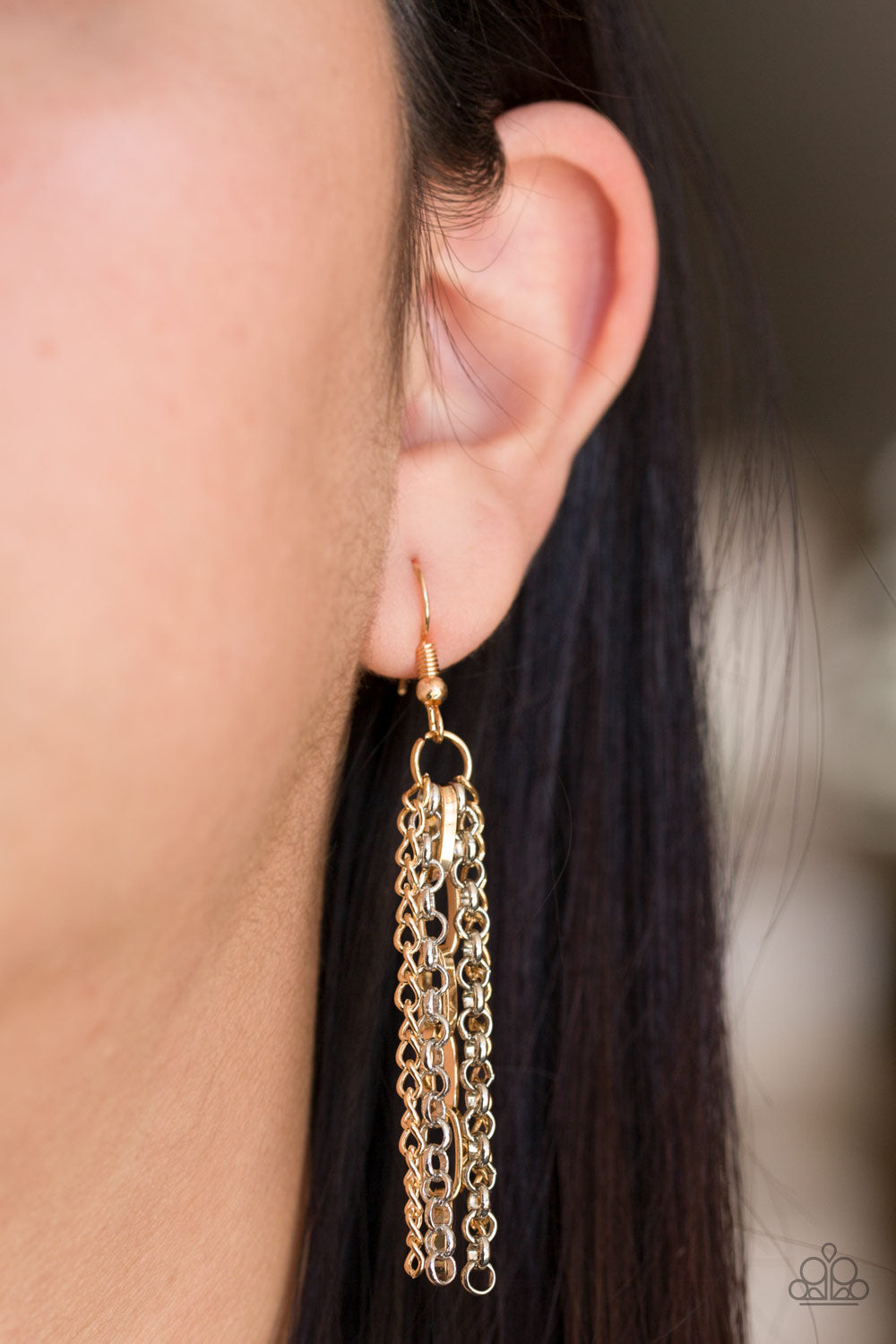 Layers of gold and silver chain fall together to create the illusion of five separate necklaces. Each gold chain is adorned with a small gold charm, including a heart and a key. A lobster clasp hangs from the bottom of the design to allow a name badge or other item to be attached. Features an adjustable clasp closure.