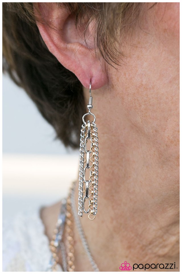 Layers of gold and silver chain fall together to create the illusion of five separate necklaces. Each silver chain is adorned with a small silver charm, including a heart, a key, and a silver disc warped with light-catching texture. Features an adjustable clasp closure. Sold as one individual necklace. Includes one pair of matching earrings.