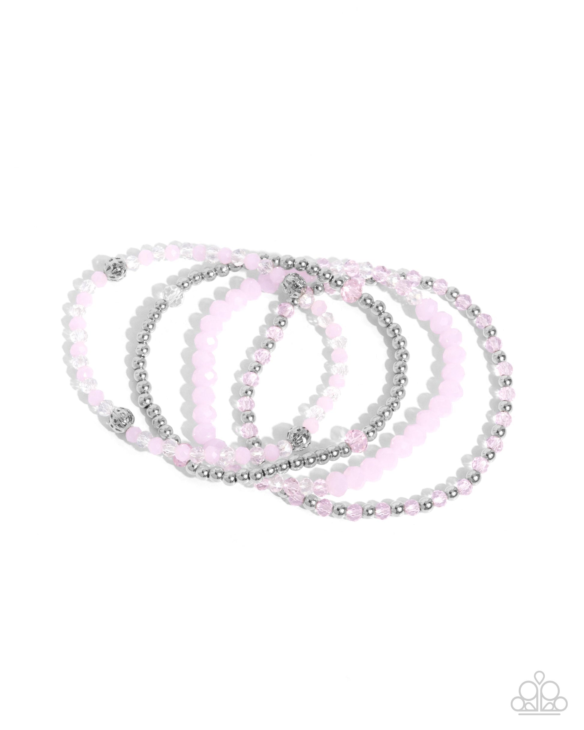Infused along elastic stretchy bands, a collection of silver beads, textured silver beads, baby pink seed beads, crystal-like faceted pink and white beads in varying sizes, and pink faceted beads in varying sizes shimmer and stack atop the wrist for a spot of color and charisma.