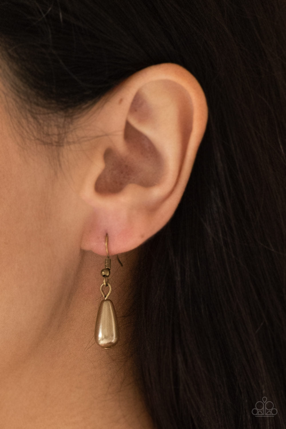 Pearly brass teardrop beads swing from the tops of delicately hammered brass teardrop frames, creating a refined fringe below the collar. Features an adjustable clasp closure.