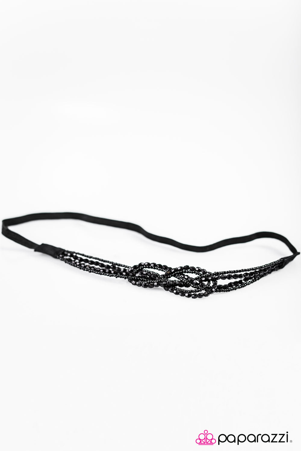 Strands of faceted black beading weave with strands of dainty seed beads brushed in a shiny finish, creating a nautical inspired knot along the forehead.