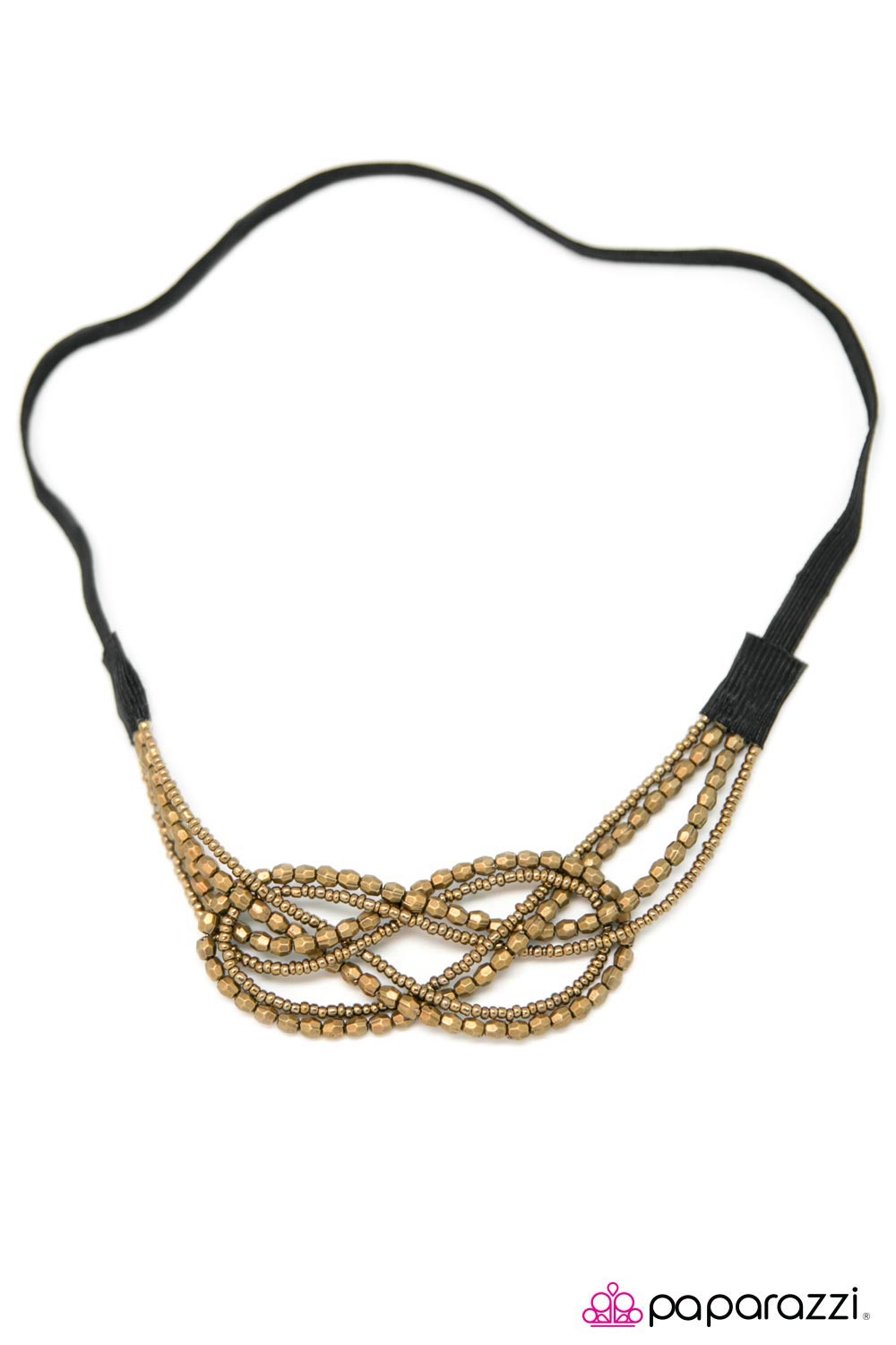 Strands of faceted brass beading weave with strands of dainty seed beads brushed in a metallic finish, creating a nautical inspired knot along the forehead.