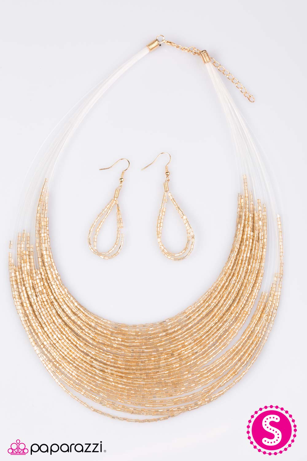 Strand after strand of glassy gold beads fall together to create a bold statement piece below the collar. Features an adjustable clasp closure.