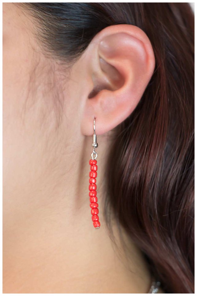 Three strands of long, Silver chain fall together in a tiered design. Geometric silhouettes in a matching silver finish accent the top two chains, while a shock of red seed beads anchors the design. Features an adjustable clasp closure. Sold as one individual necklace. Includes one pair of matching earrings.