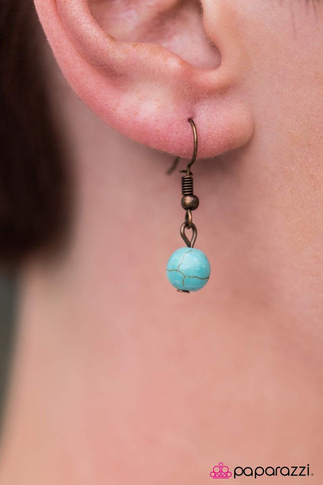 Dainty copper beading and tiny blue stones trickle along a long copper chain, creating a rustic shimmering display. Brushed in lifelike textures, a copper feather pendant swings from the bottom of the design for a whimsical flair. Features an adjustable clasp closure. Sold as one individual necklace. Includes one pair of matching earrings.