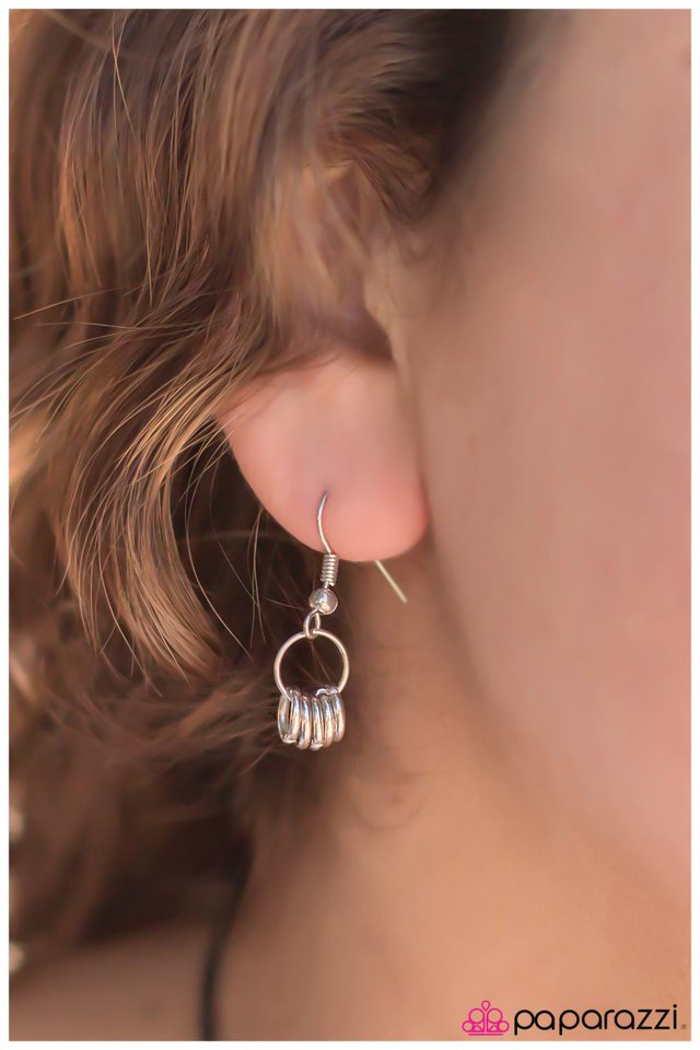 A long strand of black cording is sectioned off with knots and decorated by springs and stacks of silver links. Features an adjustable clasp closure. Sold as one individual necklace. Includes one pair of matching earrings.