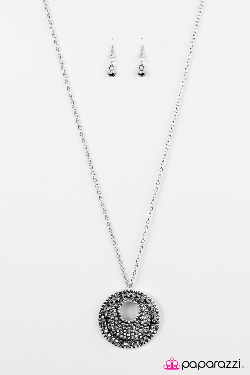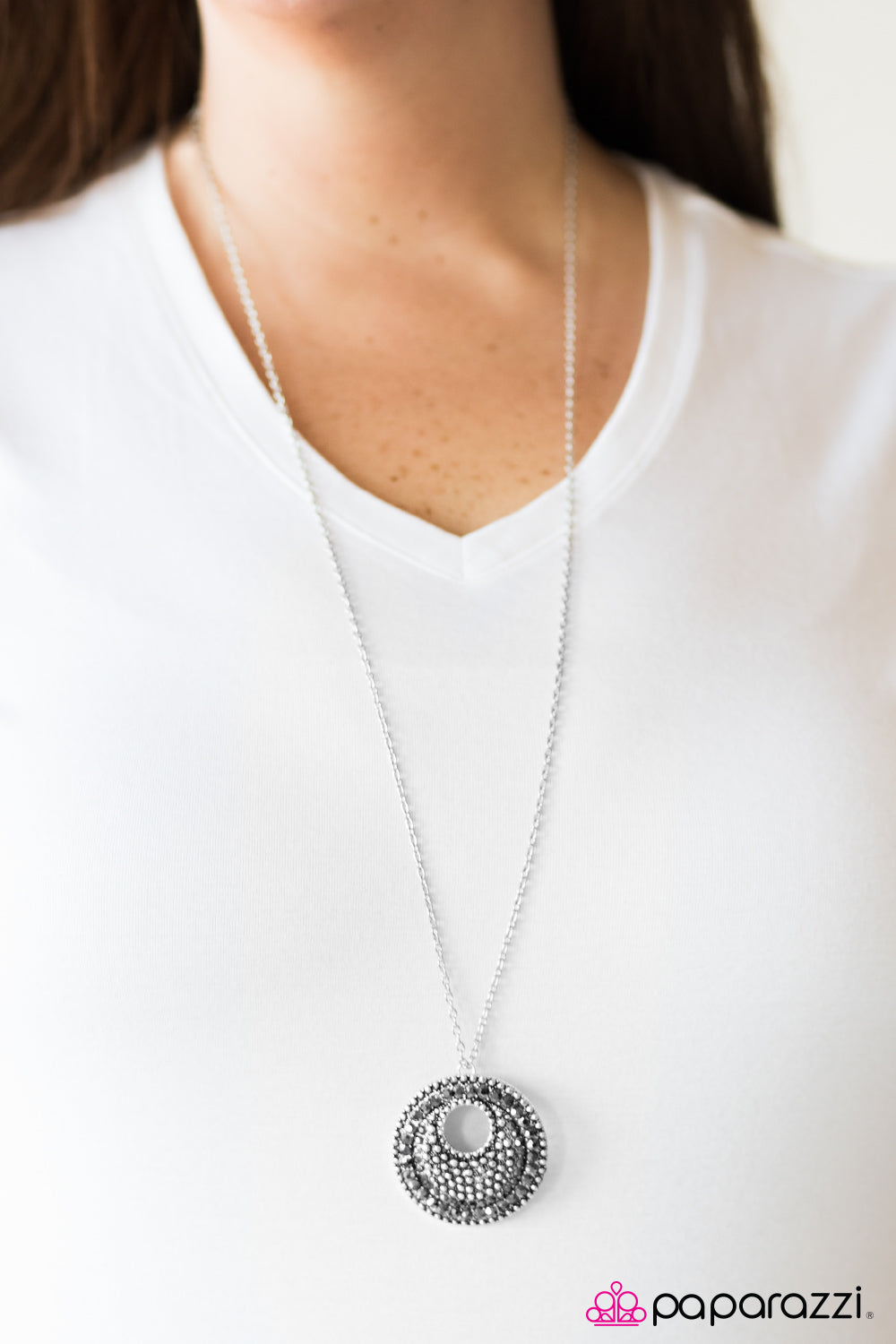 Embossed in studded textures, a beveled silver pendant swings from the bottom of an elongated silver chain in a dramatic fashion. Glittery hematite rhinestones are haphazardly sprinkled across the frame, adding edgy metallic accents to the tactile palette. Features an adjustable clasp closure.