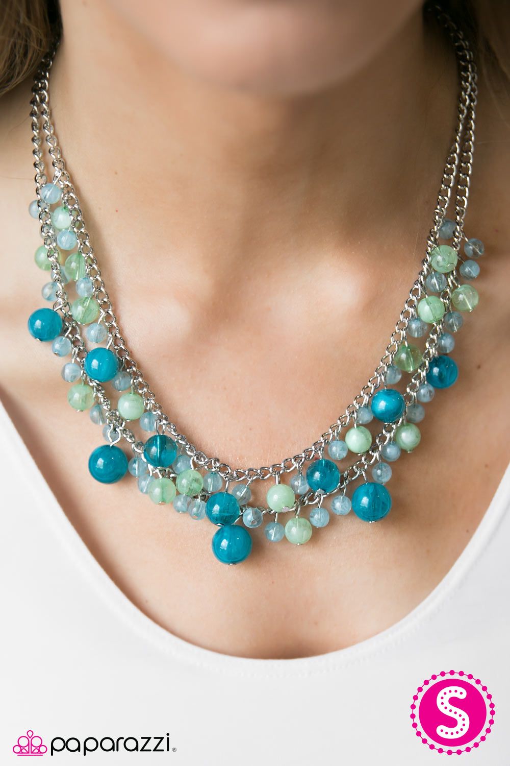 Glassy blue and green beading trickles along two shimmery silver chains, creating colorful layers below the collar. Featuring a variety of opacity and size, the gorgeous beading falls into a summery inspired fashion. Features an adjustable clasp closure.