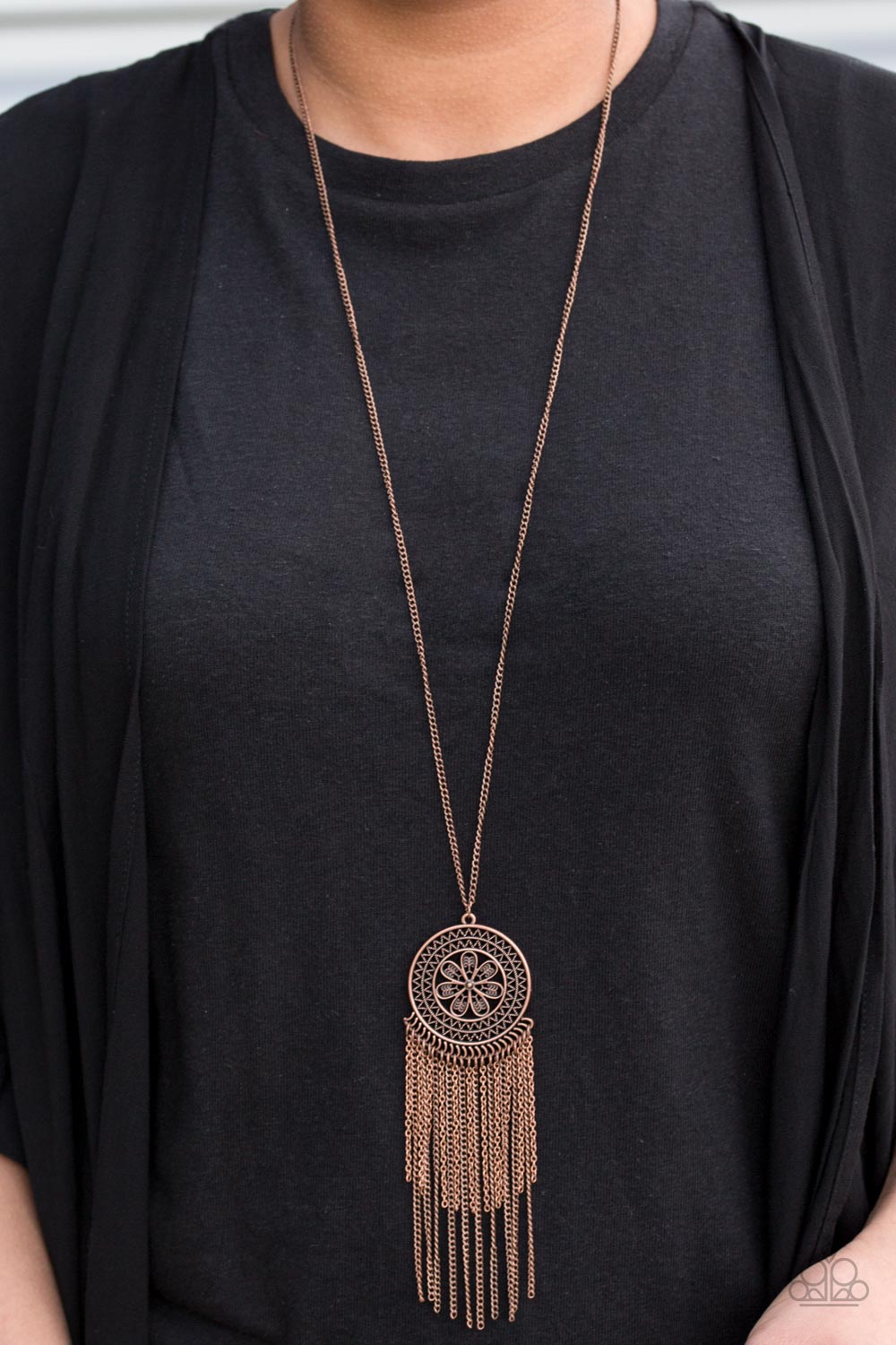 An ornate copper floral pendant swings from the bottom of an elongated copper chain. Brushed in an antiqued shimmer, copper chains stream from the bottom of the floral pendant for a whimsical finish. Features an adjustable clasp closure.