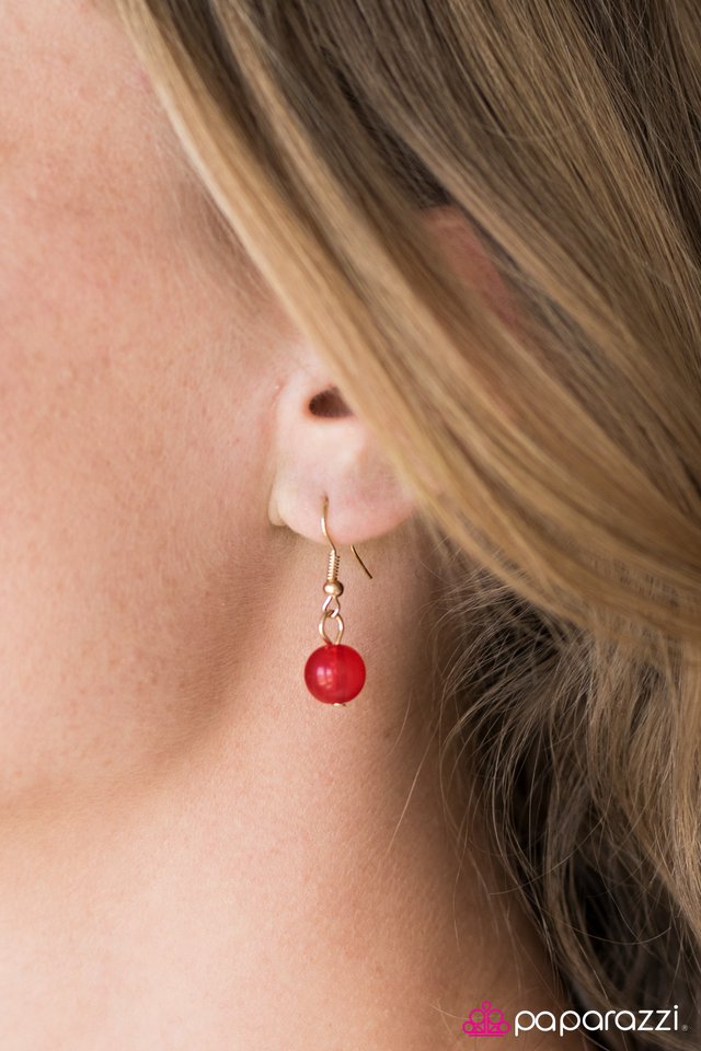 Colorful red, black, and gray beads featuring polished and opaque finishes trickle along a shimmery gold chain. Shiny and ornate gold beads are added to the whimsical palette for a gleaming finish. Features an adjustable clasp closure. Sold as one individual necklace. Includes one pair of matching earrings.