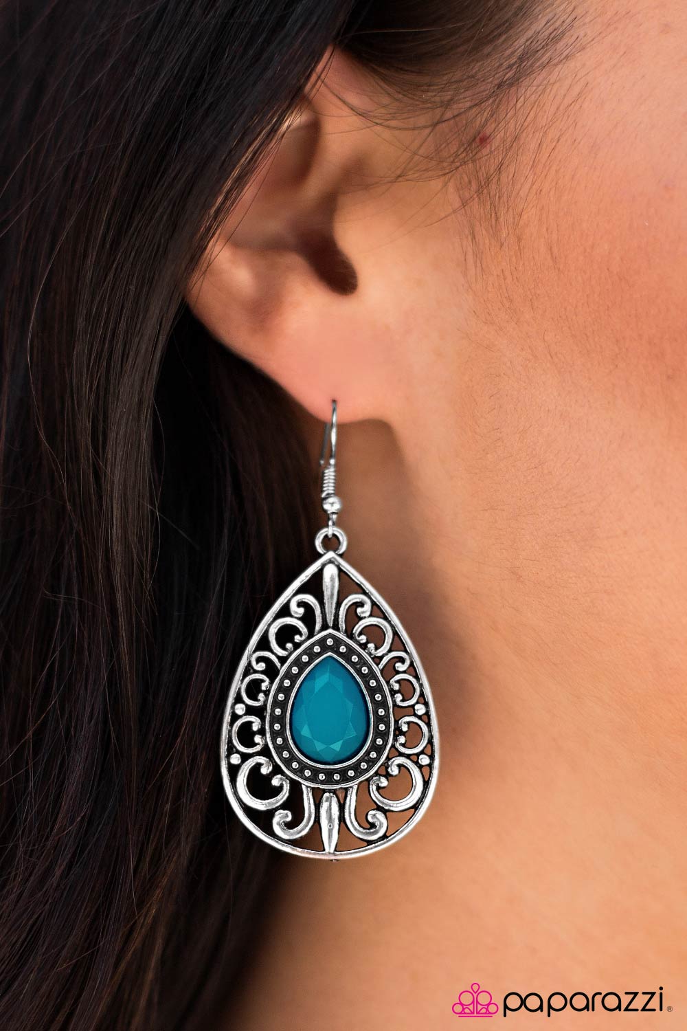 Swirls of silver filigree create an airy teardrop-shaped frame that wraps around a faceted teardrop bead tinted in the refreshing shade of Deep Caribbean. Earring attaches to a standard fishhook fitting.