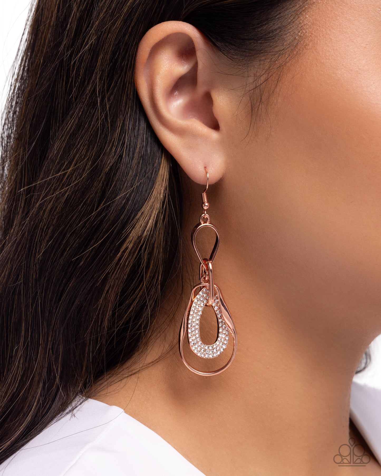 A cascade of interlocking shiny copper frames layers into an abstract chandelier. One sleek shiny copper teardrop is encrusted in rows of dainty white rhinestones, adding a glittery element to the asymmetrical display. Earring attaches to a standard fishhook fitting.