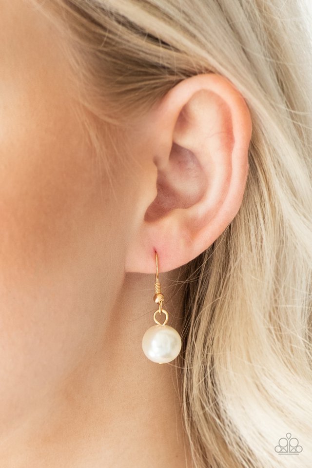 Oversized gold, crystal-like, and pearly white beads are threaded along an invisible wire below the collar for a glamorous look. White rhinestone encrusted rings are sprinkled between the dramatic beads for a sparkling finish. Features an adjustable clasp closure. Sold as one individual necklace. Includes one pair of matching earrings.