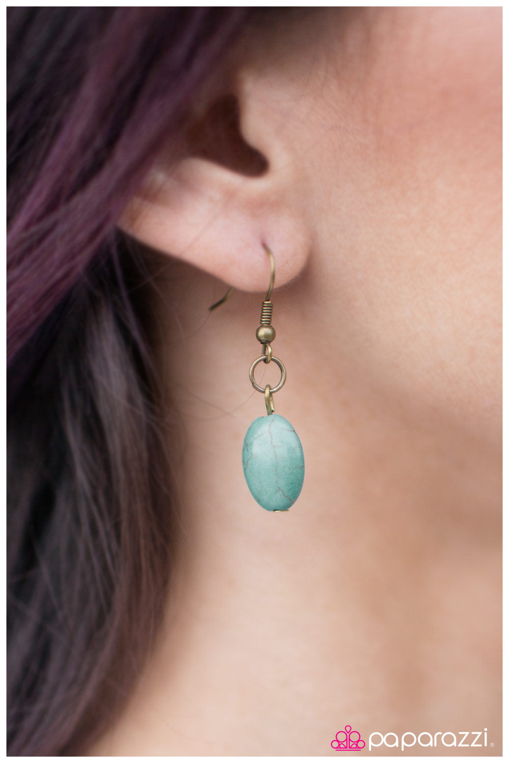Dainty brass chains stream from the bottom of a chunky brass pendant featuring a smooth turquoise stone center. Brushed in an antiqued finish, an indigenous inspired pattern frames the stone for an artisan inspired accent. Features an adjustable clasp closure.