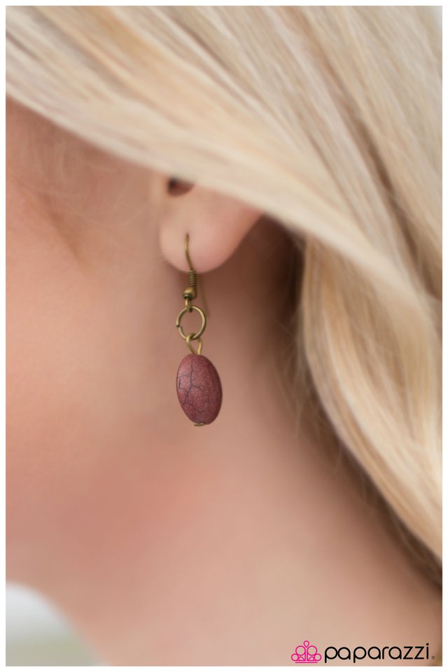 Dainty brass chains stream from the bottom of a chunky brass pendant featuring a smooth reddish-brown stone center. Brushed in an antiqued finish, an indigenous inspired pattern frames the stone for an artisan inspired accent. Features an adjustable clasp closure. Sold as one individual necklace. Includes one pair of matching earrings.