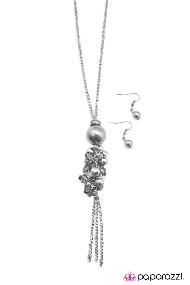 Hanging from the bottom on an elongated silver chain, silver beads featuring a pearlescent shimmer coalesce into an elegant tassel. Infused with glistening silver gems, dainty silver chain streams from the bottom, adding a refined finished to the classy pendant. Features an adjustable clasp closure. Sold as one individual necklace. Includes one pair of matching earrings.