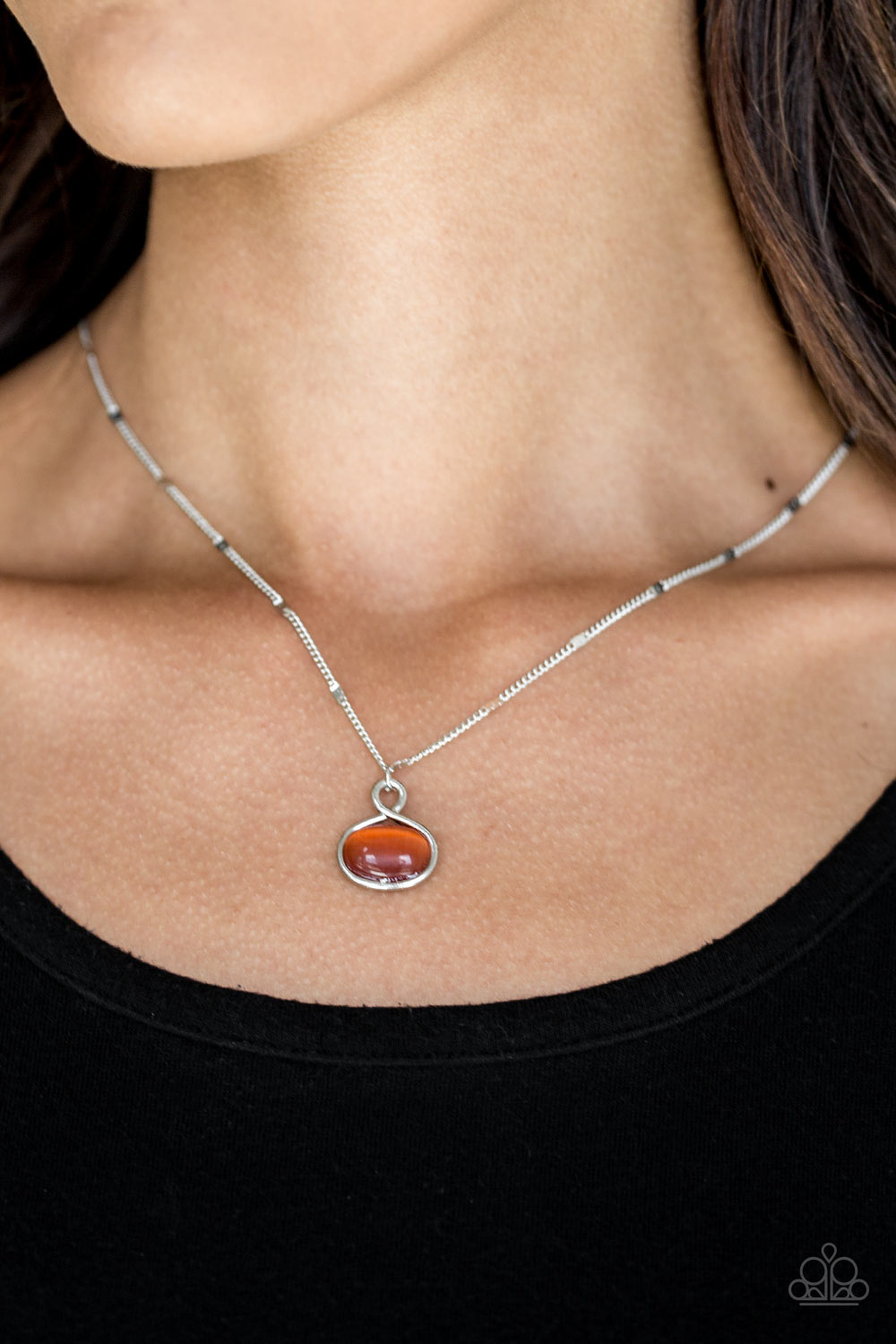 A ribbon of silver curls around a glowing orange moonstone, creating a whimsical pendant below the collar. The luminescent pendant slides along a shimmery silver chain featuring sections of flattened links for a glistening finish. Features an adjustable clasp closure.