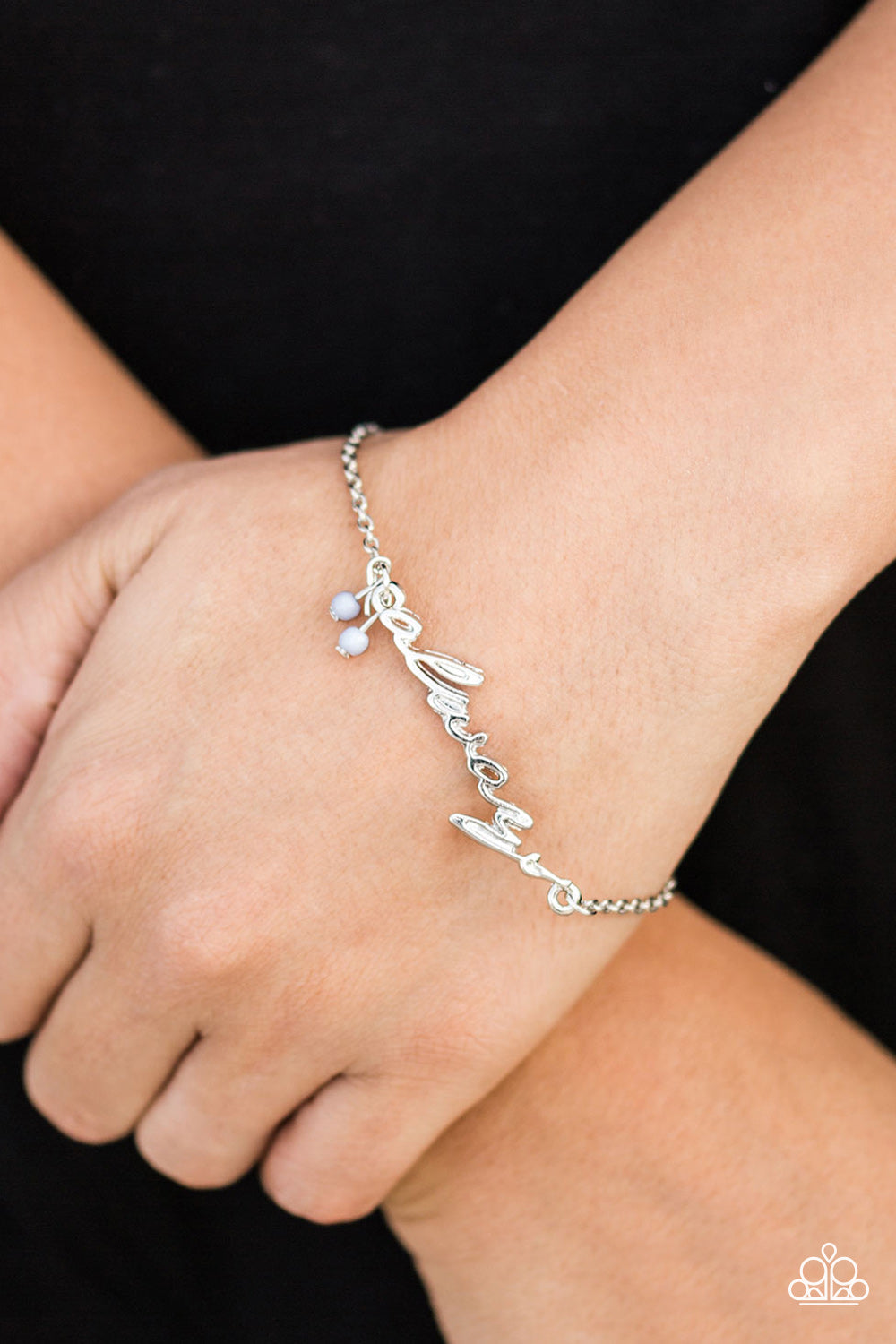 Shiny silver dances into a whimsical charm spelling “always” delicately across the wrist. Dainty gray beads dangle from the side of the charm as a subtle accent. Features an adjustable clasp closure.