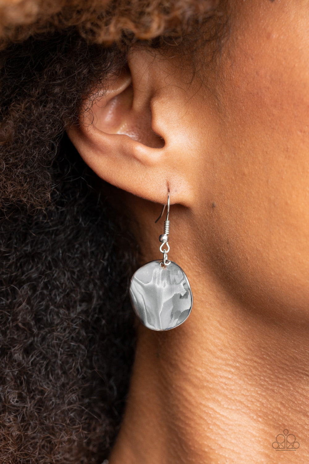 Featuring a colorful tie dye print, flat colorful discs swirled in tones of yellow, blue, and pink combine with curved silver discs, swinging from the bottom of a bulky silver chain for a trendy throwback look. Features an adjustable clasp closure.