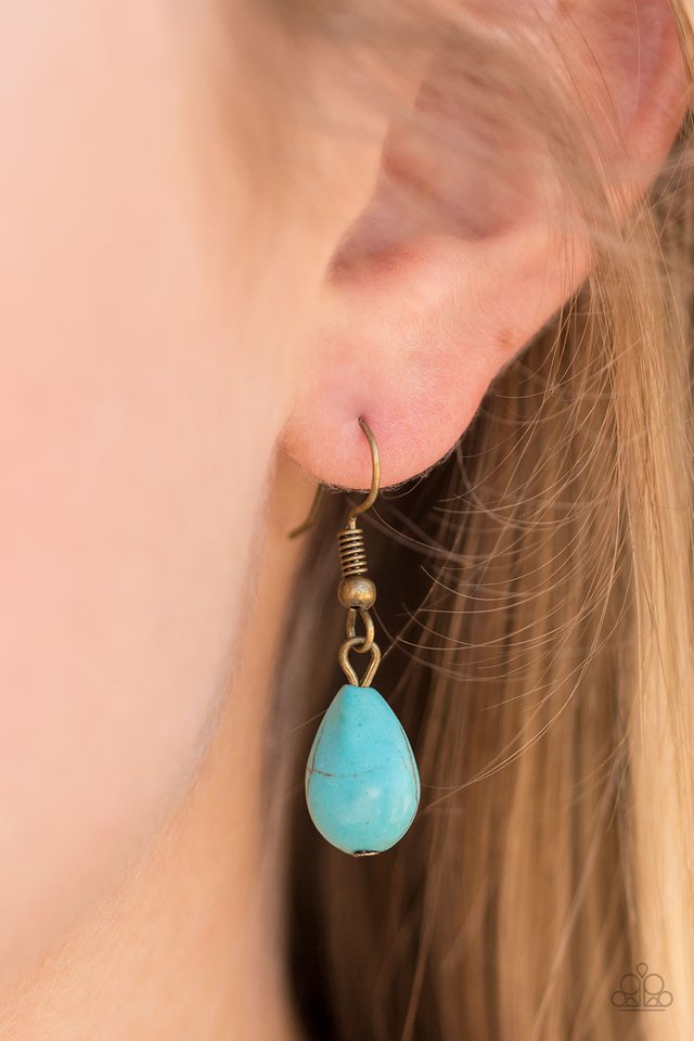 Stamped in stunning tribal patterns, dramatic floral frames link below the collar in a seasonal fashion. Turquoise teardrop stones are pressed into the centers of the spectacular frames, adding a refreshing pop of color to the brass artisanal palette. Features an adjustable clasp closure. Sold as one individual necklace. Includes one pair of matching earrings.