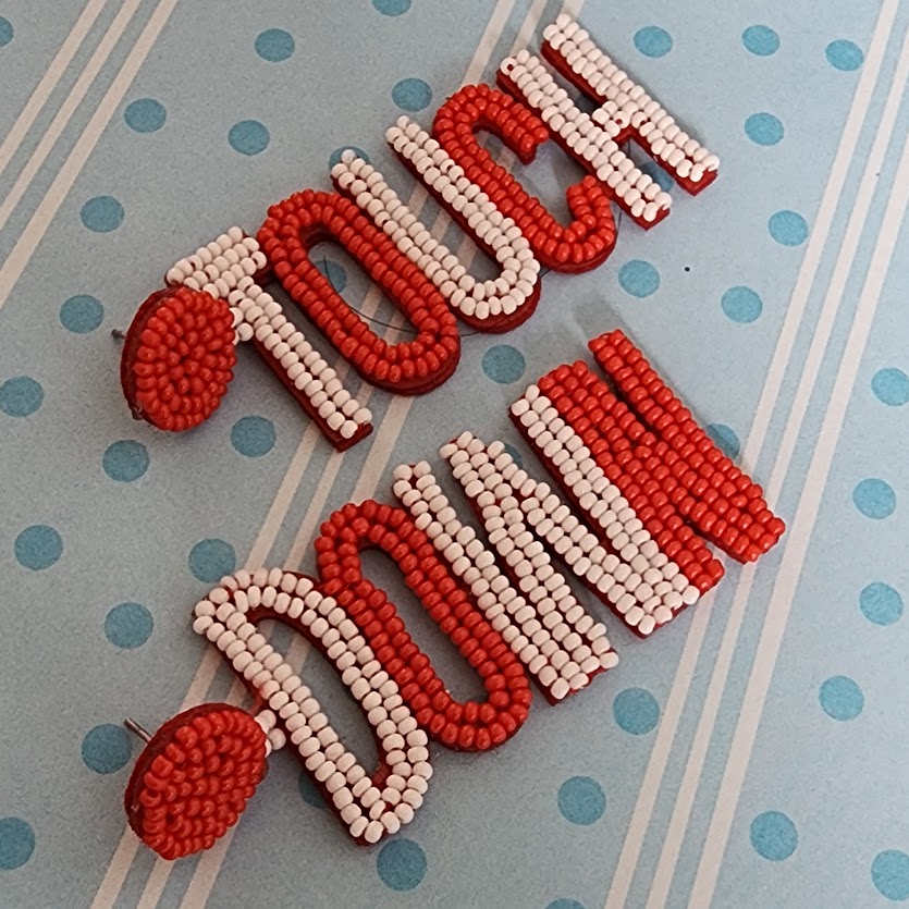 A red seed bead-embellished red felt post gives way to the words "TOUCH DOWN" formed from white and red seed beads that alternate below the ear for a sporty sensation. Earring attaches to a standard post fitting.