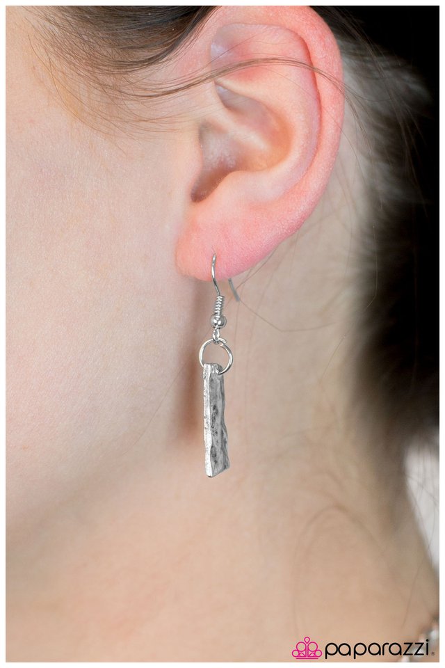 Rustic silver plates hammered with texture are threaded along a silver chain, separated by small blue beads. Features an adjustable clasp closure. Sold as one individual necklace. Includes one pair of matching earrings.