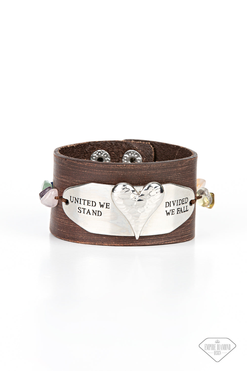 A strand of raw cut multicolored pebbles is threaded through the edges of a curved metal plate, studding the asymmetrical frame in place across the front of a distressed brown leather band. The silver frame is adorned with a hammered silver heart and stamped in the inspiring phrase, "United we stand/Divided we fall." Features an adjustable snap closure.