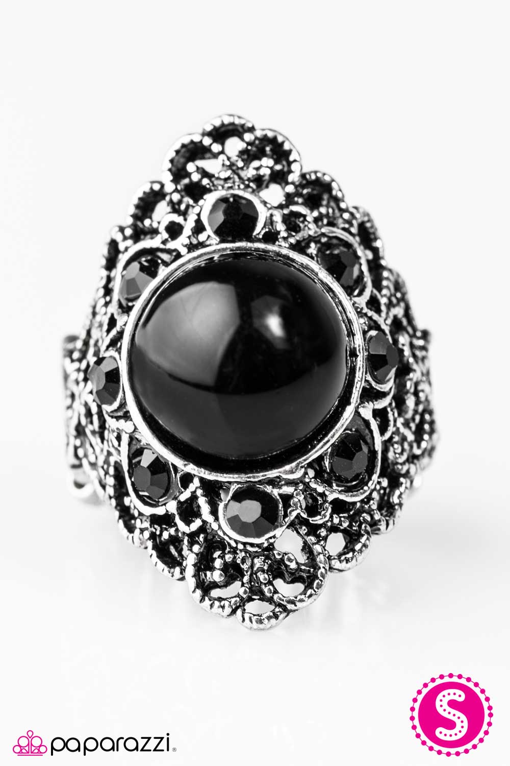 A frilly silver frame spins around a polished black center, creating a vintage inspired band around the finger. Dotted in black rhinestones, the bold center pops from the filigreed frame for a perfect splash of color.