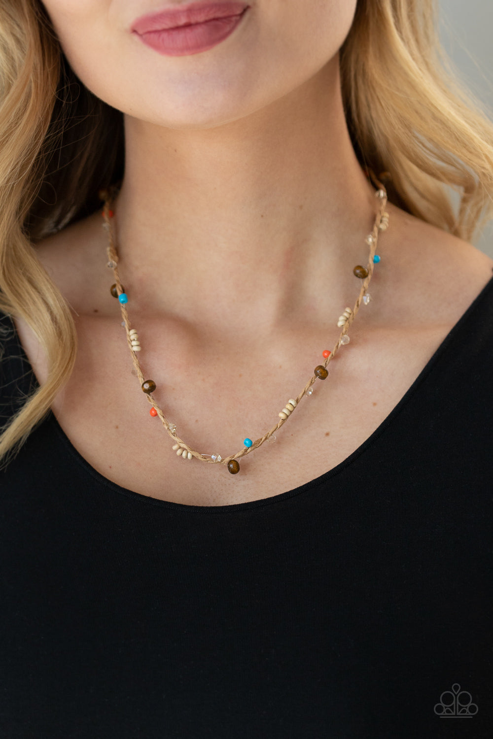 A dainty collection of colorful wooden beads and sparkly crystal-like accents are knotted in place along a strand of earthy twine that loops around the neck for a beach inspired look. Features a button loop closure.