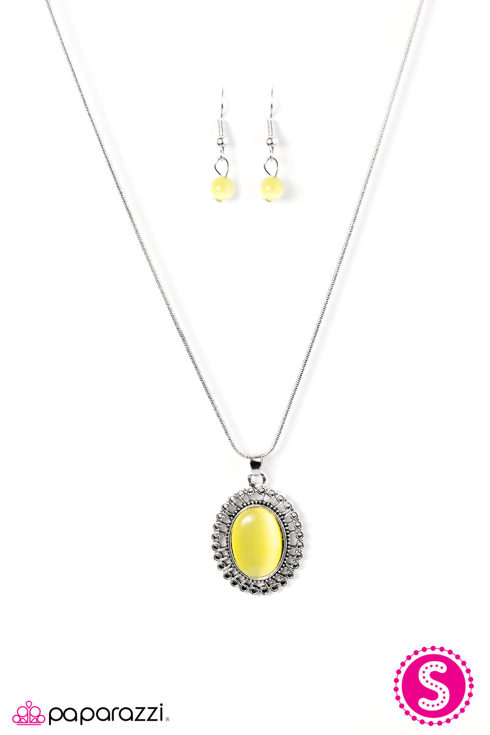 A yellow moonstone is pressed into the center of a frilly silver frame, creating a beautiful pop of color below the collar. Features an adjustable clasp closure.