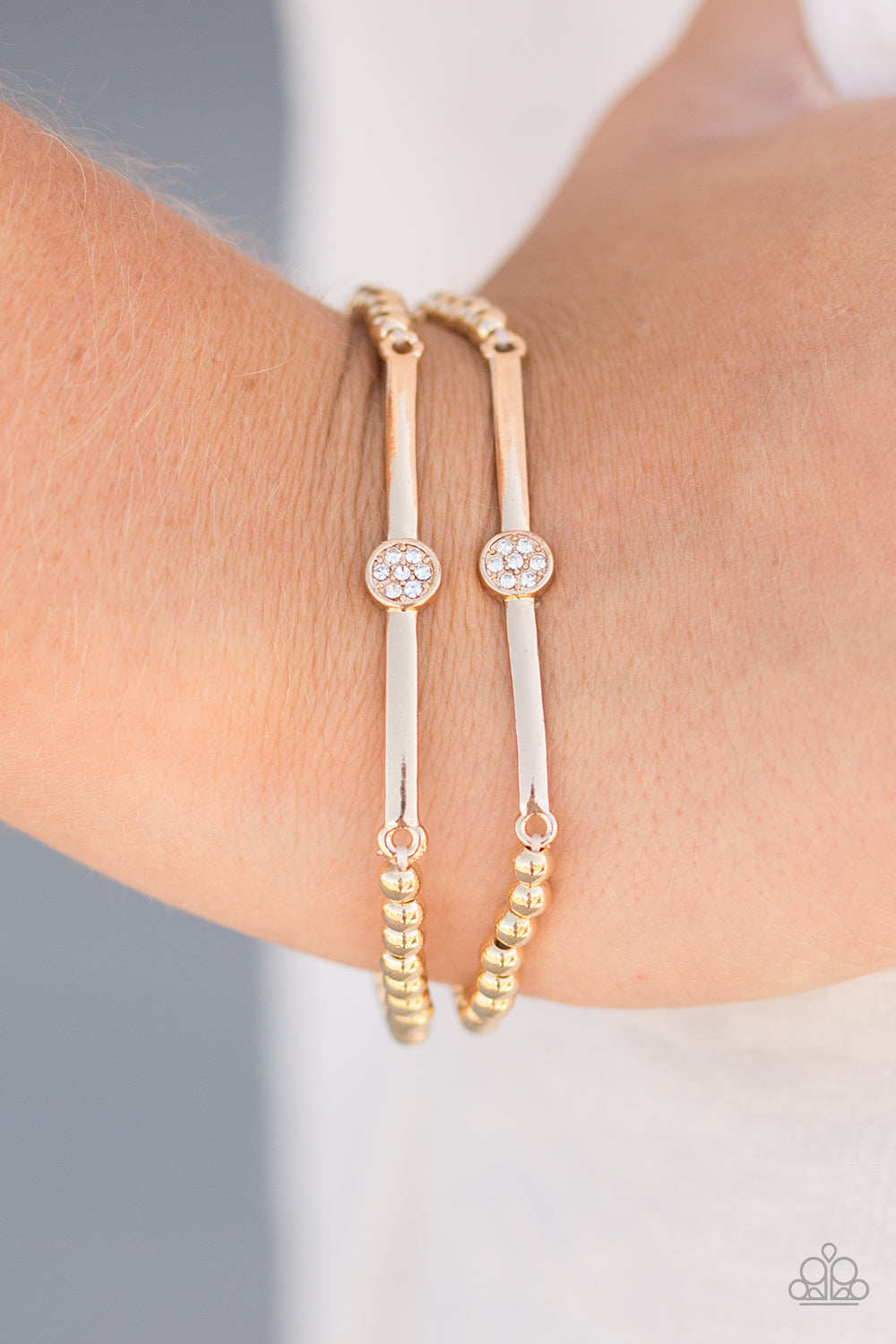 Dainty gold beads are threaded along two elastic stretchy bands, creating a pair of dainty bracelets. Dotted with a dainty rhinestone center, sleek gold bars attach to the beaded strands, creating stunning centerpieces.