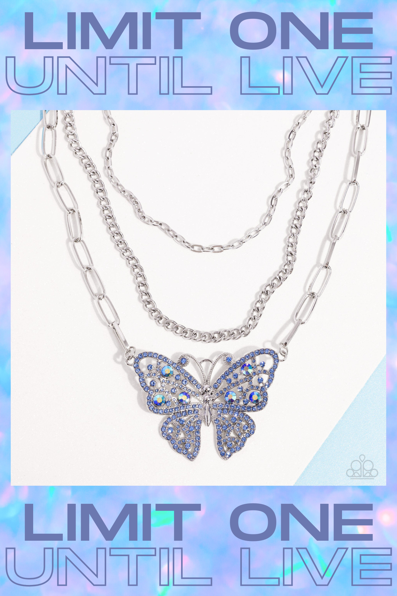 Three mismatched silver chains interlock and cascade around the neckline in endless layers. A light sapphire and light sapphire iridescent-infused silver butterfly flutters at the bottom of the display for a whimsical finish. Features an adjustable clasp closure. Due to its prismatic palette, color may vary.