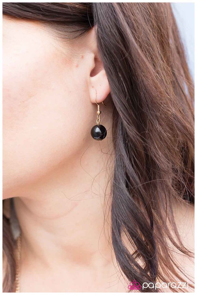 Sparkling black beads are nestled between two classic black beads along a gold chain. One gold ring dotted with rhinestones and one gold bead in a high-sheen finish accent the design. A lobster clasp at the bottom allows for a name badge or other item to be attached. Features an adjustable clasp closure. Sold as one individual lanyard. Includes one pair of matching earrings.
