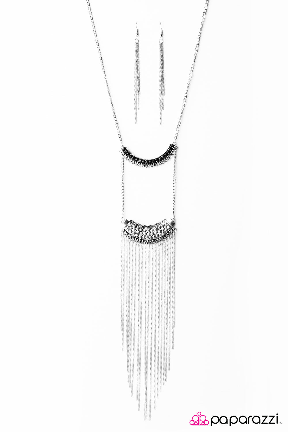 A row of glittery black rhinestones gives way to a larger silver plate, creating layered pendants. Infused with faceted silver studs, trestles of dainty silver chain fall from the lowermost pendant for a whimsical finish. Features an adjustable clasp closure.