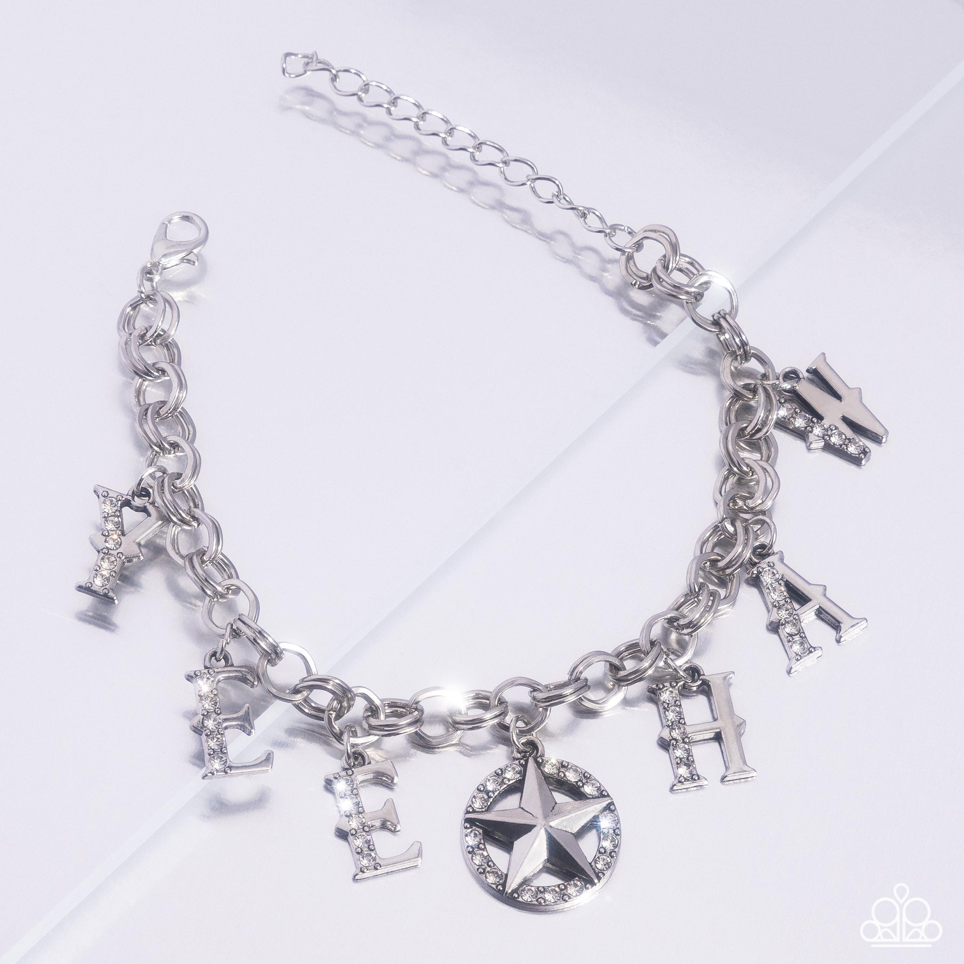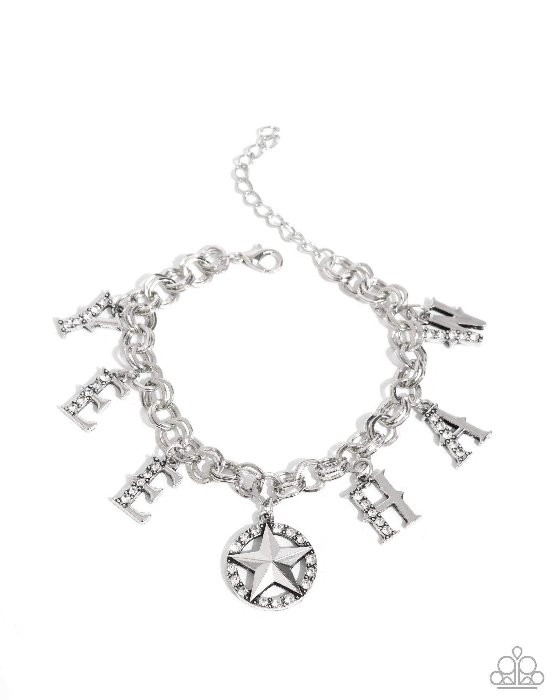 Swinging along doubled rings of silver, a collection of silver serif words lined with a row of white rhinestones spells out the phrase "Yee Haw" for a radiant, rambunctious display. A raised antiqued silver star charm sits atop a circle of rhinestones, separating the words "Yee Haw" for additional Western-inspired whimsy and shimmer. Features an adjustable clasp closure.